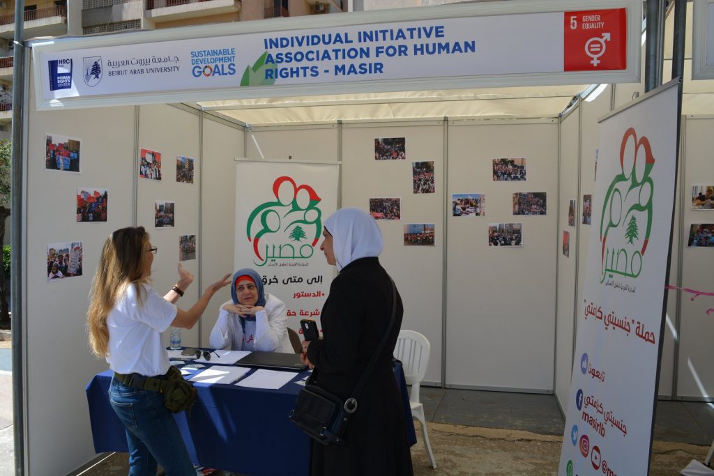 شاركت جمعية المبادرة الفردية لحقوق الإنسان-مصير (حملة جنسيتي كرامتي) اليوم بالمعرض السابع للمنظمات غير الحكومية في لبنان تحت عنوان “أهداف التنمية المستدامة والبيئة” الذي قام بتنظيمه مركز حقوق الإنسان في جامعة بيروت العربية – حرم بيروت، وذلك برعاية رئيس جامعة بيروت العربية الدكتور عمرو جلال العدوي وبمشاركة 46 منظمة وجمعية